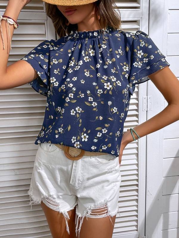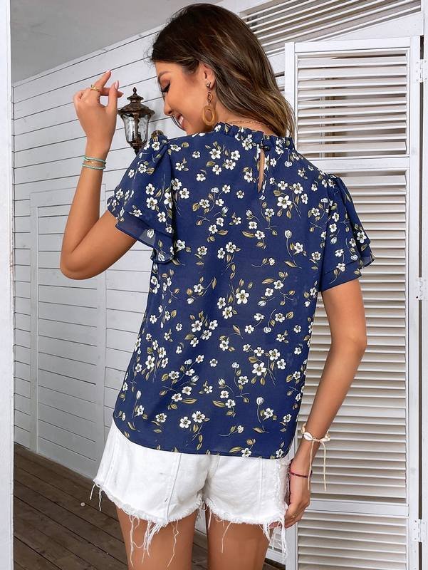 Allover Floral Print Flutter Sleeve Frilled Neck Blouse
