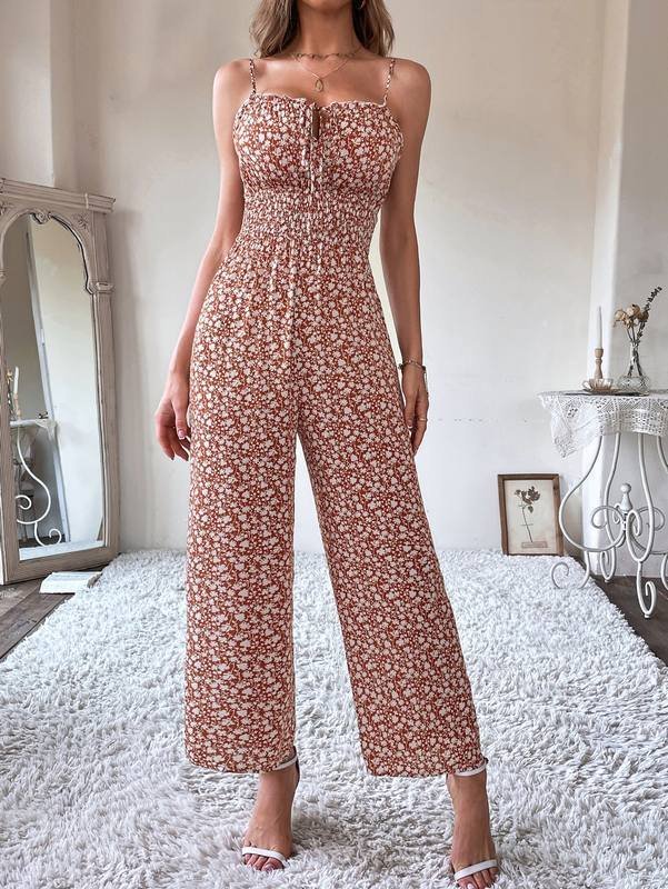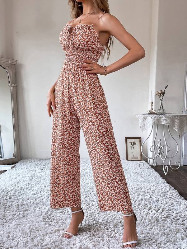 Ditsy Floral Tie Front Shirred Waist Cami Jumpsuit