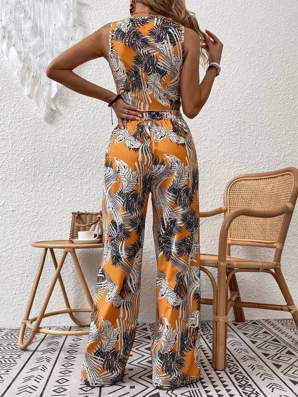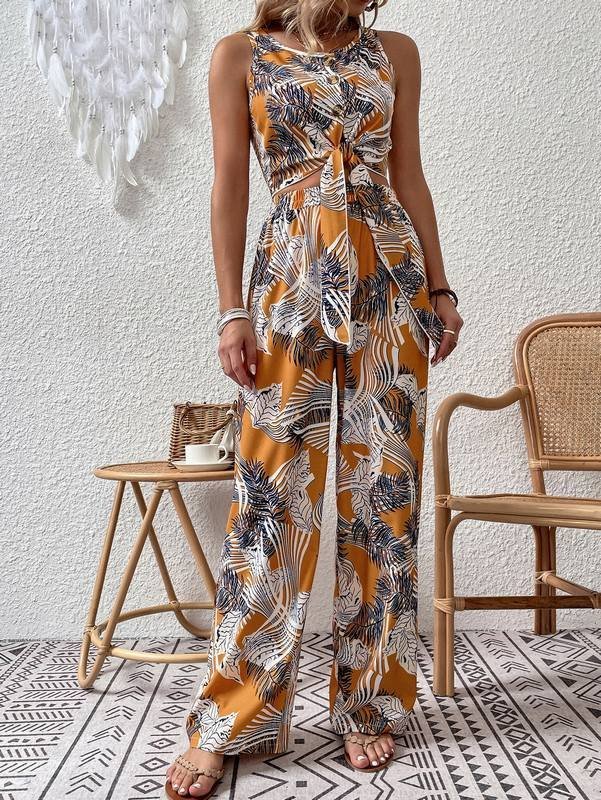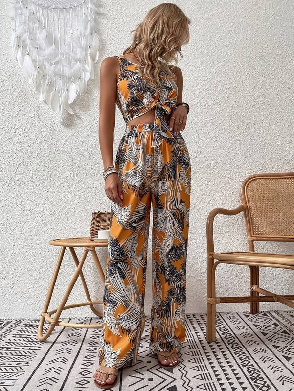 Tropical Print Knot Front Crop Tank Top & Wide Leg Pants
